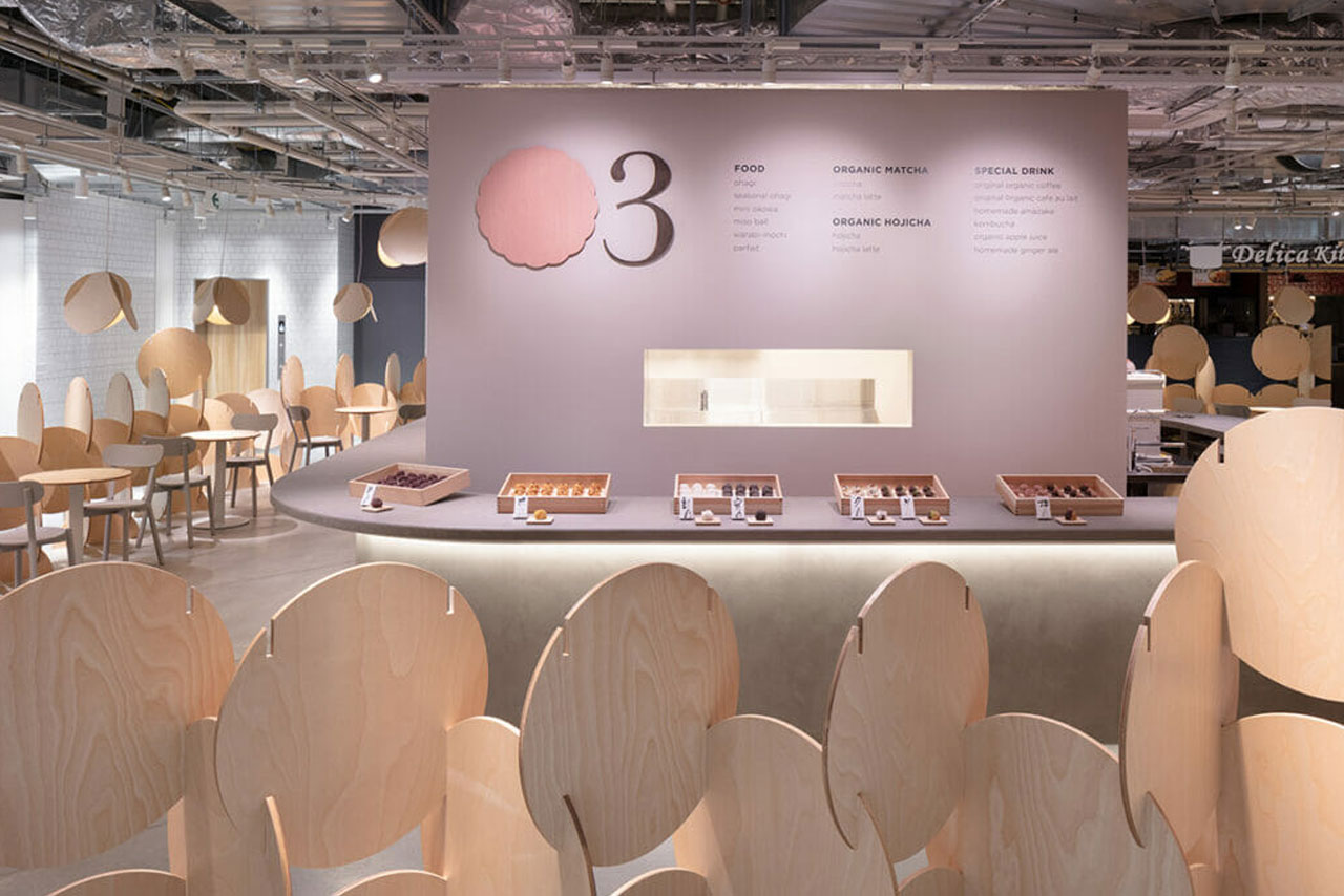 오하기의 원형을 모티프로 한 조명이나 테이블, 파티션 등의 디자인을 전반적으로 담당했다. 요즘 시대에 전통 화(和)과자를 널리 알리는, 일본 내 최초의 오하기 카페가 되었다. *오하기(お萩) : 멥쌀과 찹쌀을 섞어 쪄서 가볍게 친 다음 동그랗게 빚어 팥소나 콩가루 등을 묻힌 떡
